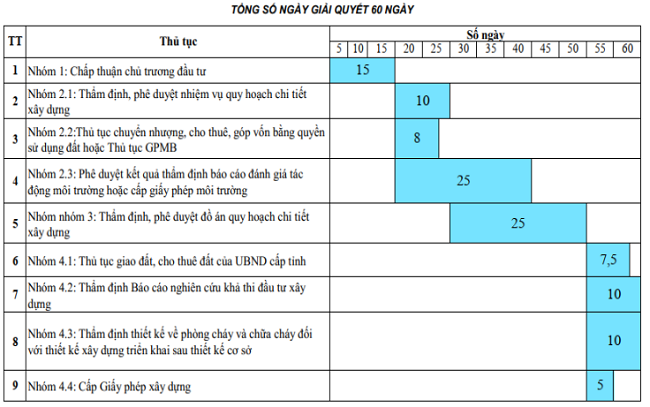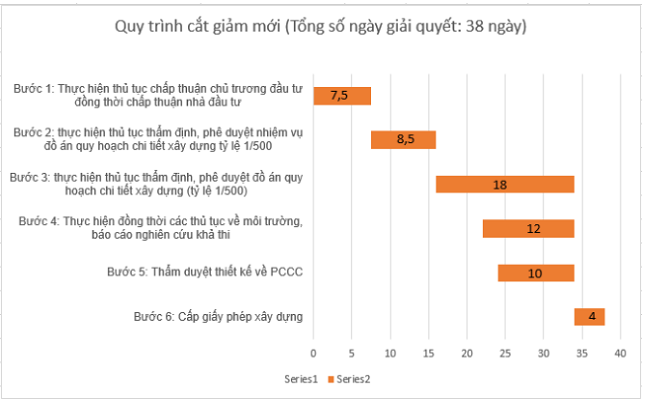 Thực hiện đồng thời thủ tục Nhóm 4: (1) Thủ tục giao đất, cho thuê đất, (2) Thẩm định báo cáo nghiên cứu khả thi đầu tư xây dựng, (3) Thẩm định thiết kế về phòng cháy chữa cháy (4) Cấp Giấy phép xây dựng. Việc thực hiện đồng thời các thủ tục Nhóm 4 giúp rút ngắn thời gian xử lý từ  32,5 ngày còn 10 ngày (giảm 22,5 ngày).